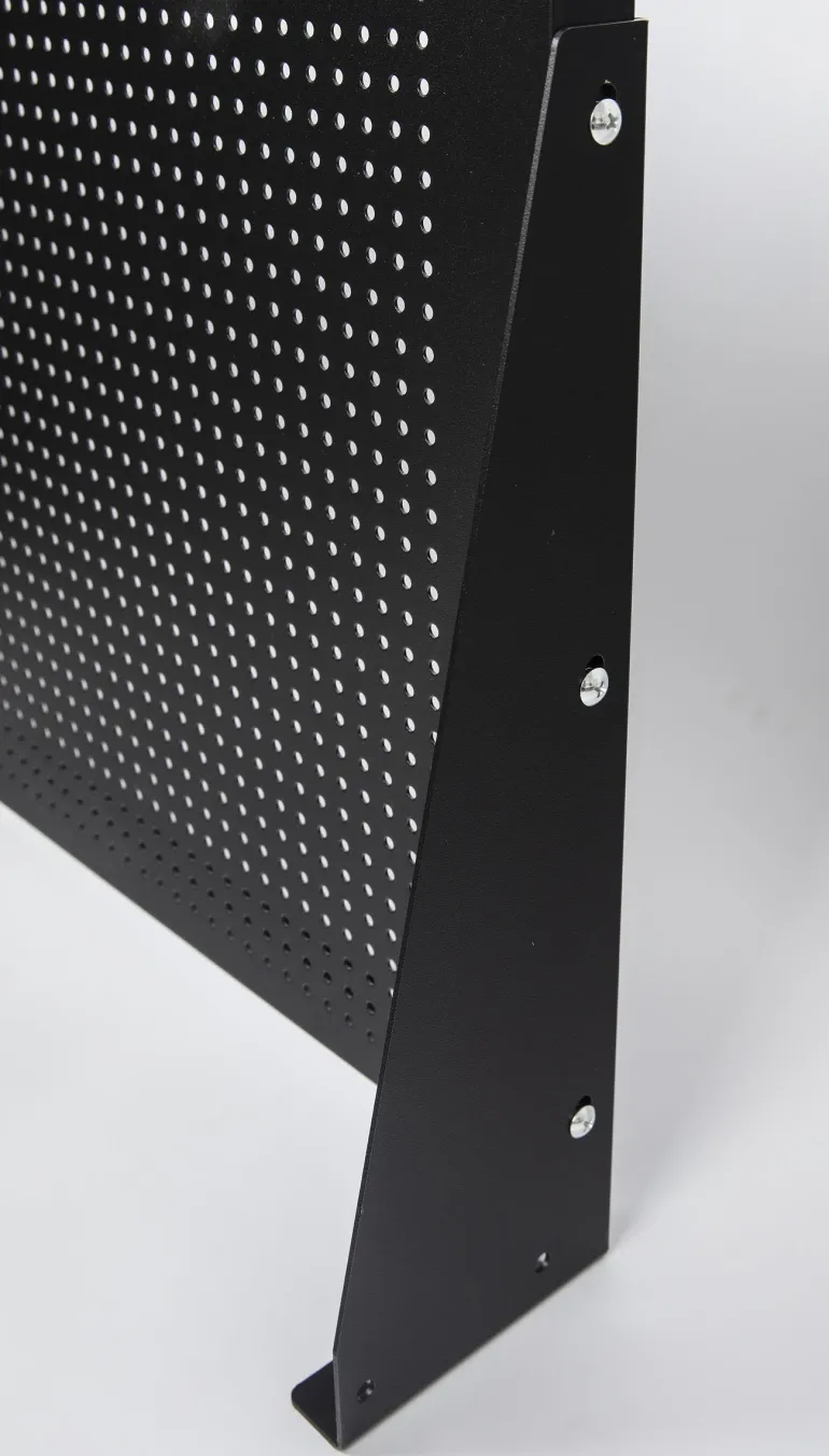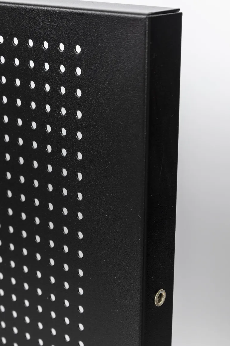 Musta työkalutaulu 2000 x 500 mm pyöreillä rei’illä ja sopii harmaamustalle työpöydälle PELA 519763.