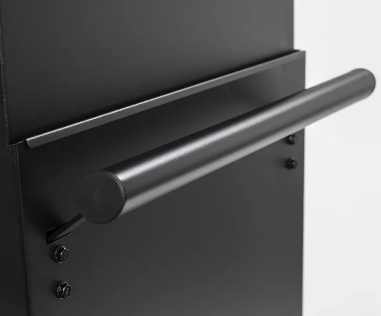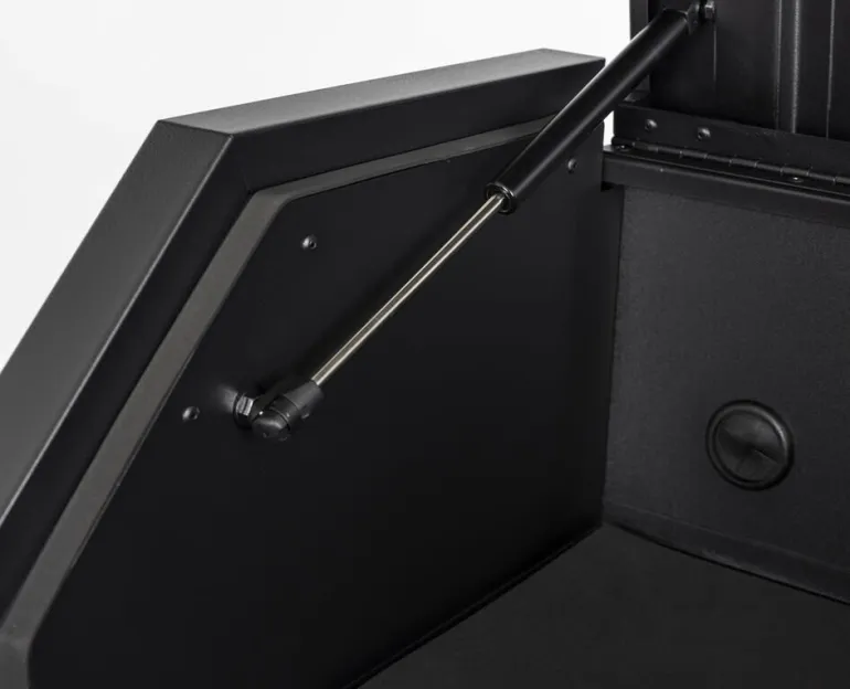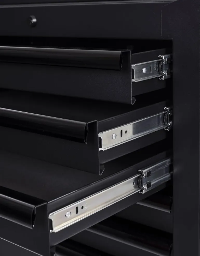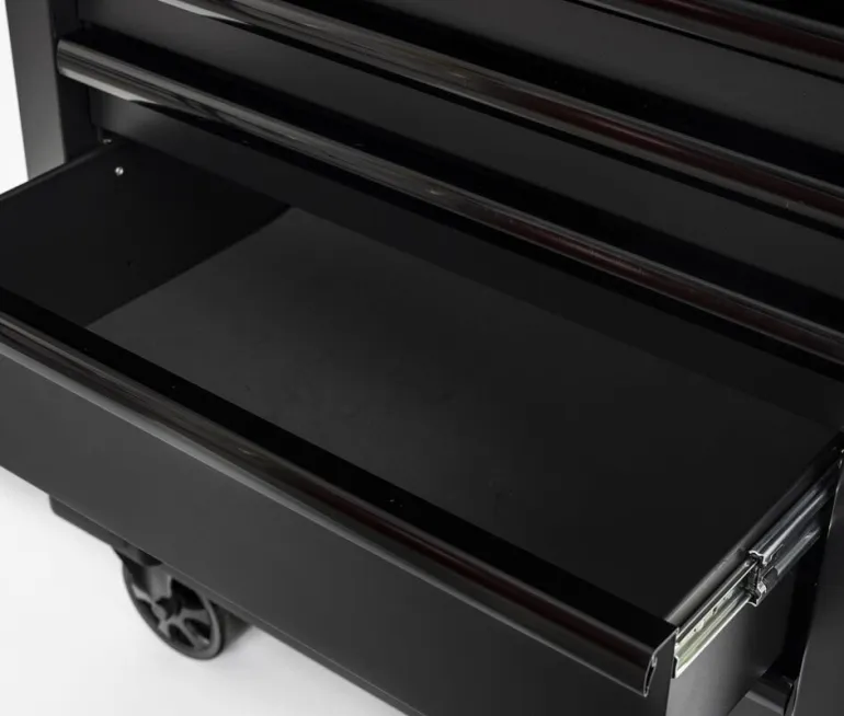 Ylälaatikollinen työkaluvaunu tukevalla rakenteella, jonka materiaalina mattamustaksi maalattu teräslevy. Tukevat kiiltävät mustat sivukahvat. Kaasujousitettu luukku, joka pitää sen tarvittaessa auki, jotta sisältö on helposti saatavilla työskentelyn aikana.