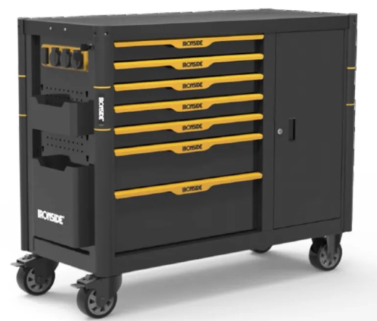 Työkaluvaunu integroidulla työkalukaapilla, kannellisilla 230V -pistorasioilla ja USB-latausporteilla. Vahva ja kestävä rakenne, vahvistetut hitsauspisteet ja naarmuuntumaton, mattapintainen maalipinta.