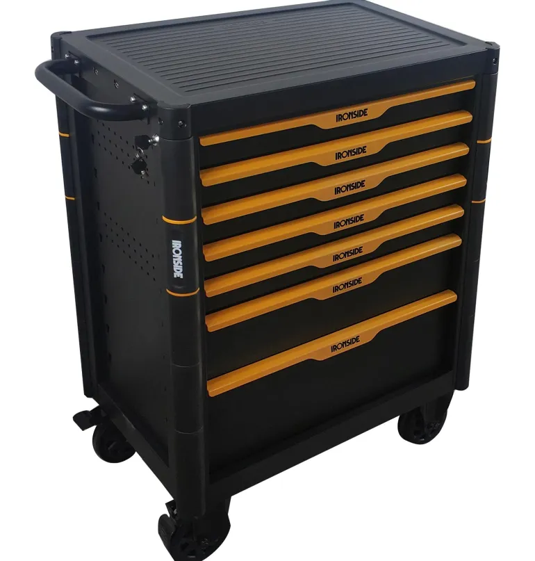 Uuden sukupolven vahvat ja tukevat työkaluvaunut, joissa on vahvistetut hitsauspisteet ja naarmunkestävä mattapulverimaali. 7 laatikkoa: 5 pientä, yksi keskikokoinen ja yksi suuri.