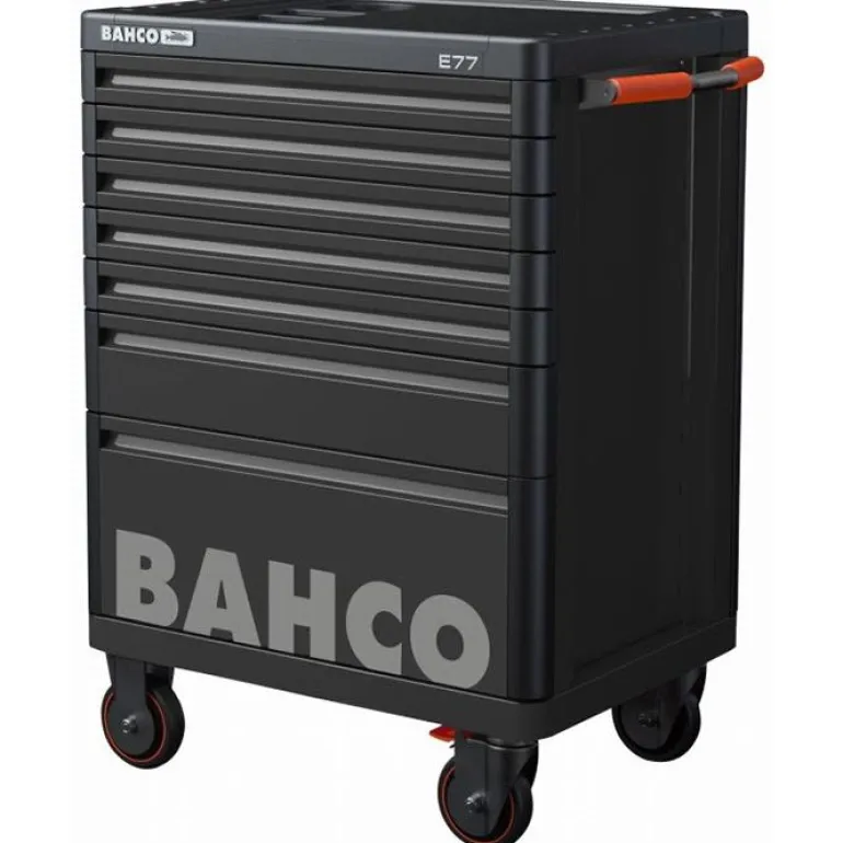 Bahco 1477K7BLACK on musta työkaluvaunu, jossa kulmasuojukset ja 7 laatikkoa. Vain yksi vetolaatikko voi aueta kerrallaan kaatumisen estämiseksi.