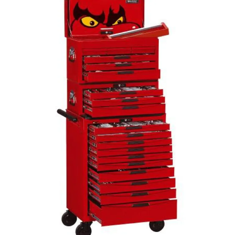 Työkaluvaunu, jossa 16 laatikkoa ja 1001-osainen työkalusarja.