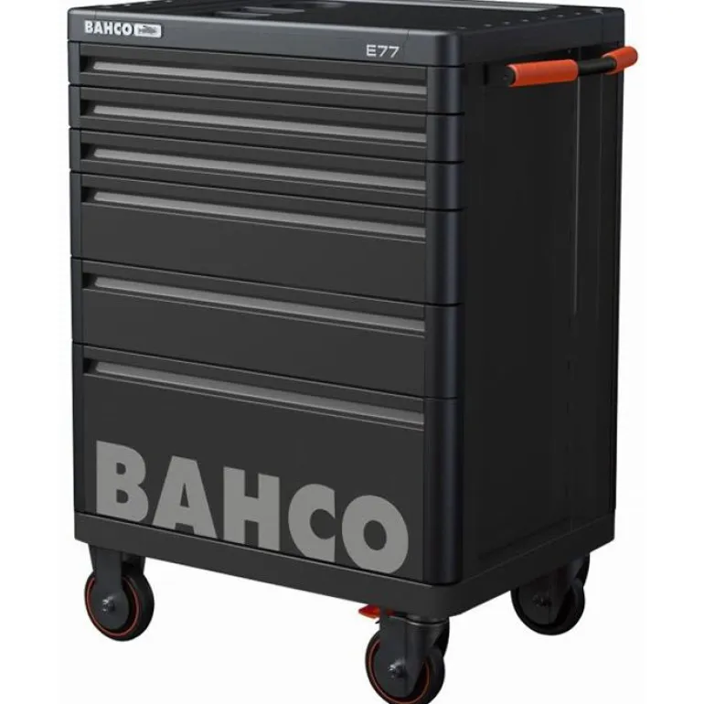 Bahco 1477K6BLACK on musta työkaluvaunu, jossa kulmasuojukset ja 6 laatikkoa. Vain yksi vetolaatikko voi aueta kerrallaan kaatumisen estämiseksi.