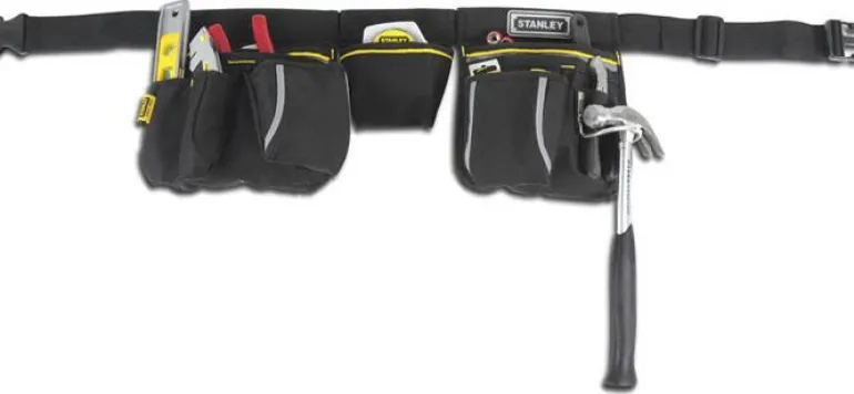 Kaksoistaskullinen työkaluvyö. 600 x 600 denierin kankaasta valmistettu – kestävä ja tukeva. Ergonominen pehmuste selässä parantaa turvallisuutta ja mukavuutta. Kiinteä metallisilmukka vasaralle. Erikokoisia taskuja ja silmukoita parantamaan järjestystä.