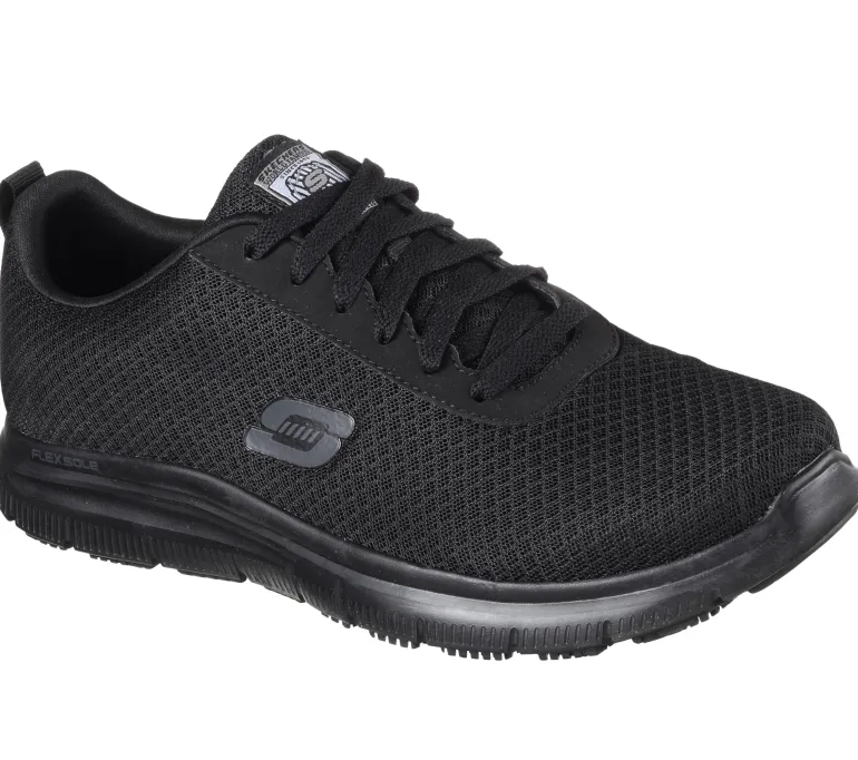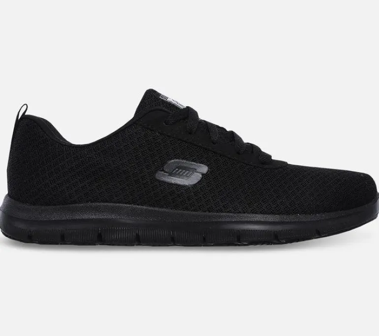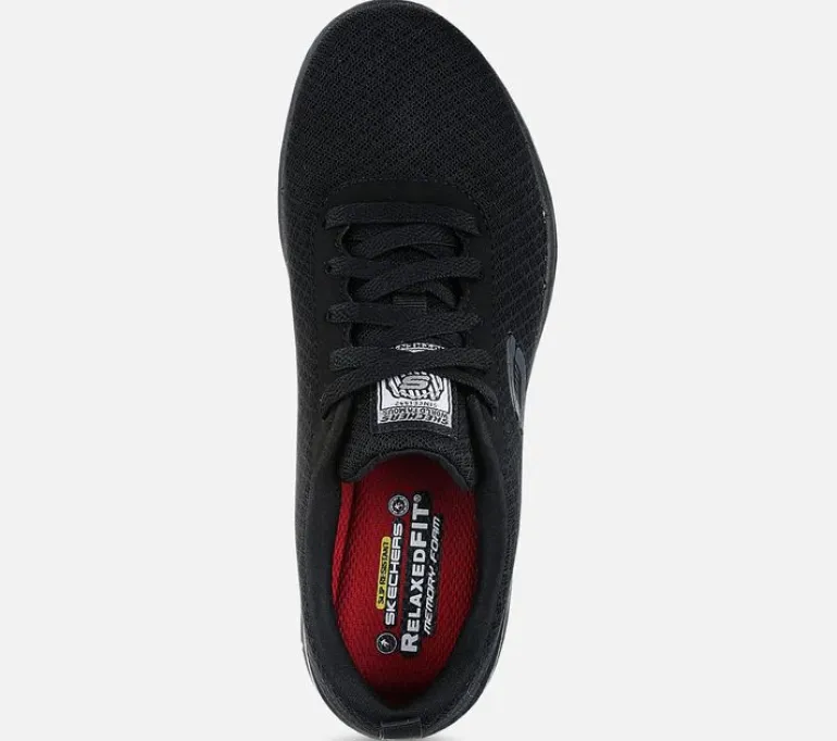 Skechers Work Relaxed Fit on liukastumisenestolla varustettu naisten työkenkä, jossa on lisätilaa jalan etuosassa. Kengän päällysosassa on hengittävää mesh-kangasta. Kengässä on lisäksi pehmeä ja hengittävä Memory Foam -sisäpohja. Ulkopohja on liukutestattu niin, että se täyttää tiukimmat turvallisuusvaatimukset.