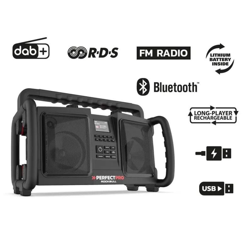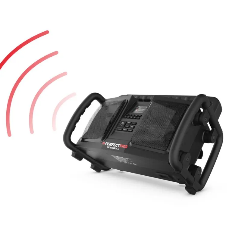 Tukeva ja tehokas työmaaradio bluetoothilla. Musiikin langattomaan suoratoistoon älypuhelimesta tai tabletilta. Ladattava sisäänrakennetun litiumakun avulla. Pölyn- ja iskunkestävä sekä vedenpitävä rakenne. Kotelo kestävää ABS-muovia, metallinen kaiutinsäleikkö, kestävät suojakaaret ja kahvat. Tehokas 2-suuntainen kaiutinjärjestelmä, jossa kaksi tehokasta 5″ ja 25 W:n bassokaiutinta (50 W) ja kaksi 1″ diskanttikaiutinta, voimanlähteenä korkealaatuinen suurtehovahvistin. Ääni leviää koko tilaan (jopa 1 000 m²).