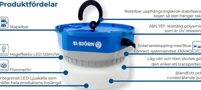 El-Björn Light Weight on pinottava valaisin, jossa on suurteholedit. Valaisin on varustettu energiaa säästävällä liiketunnistimella, joka himmentää valaisimen, kun sitä ei tarvita.
