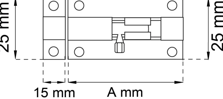 Messinkinen työntösalpa. Teljen läpimitta: 7 mm. Pituus 75 mm. Mukana ruuvit. Kiillotettu messinki.