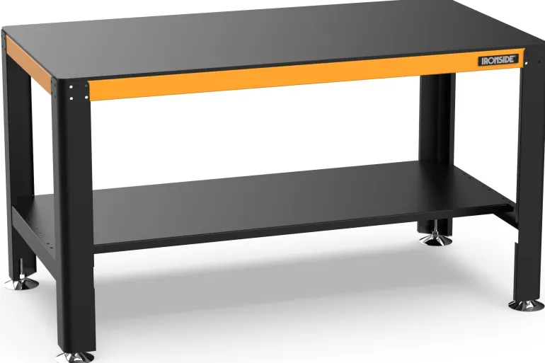 Työpöytä vahvalla rakenteella, materiaalipaksuus 3 mm pohjahylly mukaan lukien. Muovilevy työtason suojaamiseksi kuuluu toimitukseen. Korkeussäädettävät jalat.
