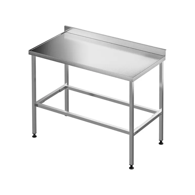 Työpöytä jalustalla (hygieninen malli), jossa työtaso 1,25 mm hiotusta ruostumattomasta teräksestä. Voidaan täydentää hyllyllä/ritilähyllyllä (irrotettava).