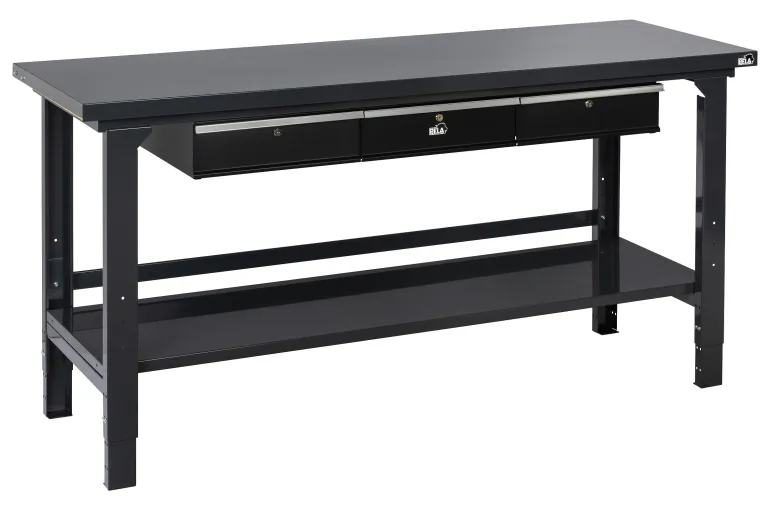 Tukeva 2000×650 mm työpöytä laatikkosarjalla ja laskutasolla. Työpöydällä on tukeva teräsrakenne, jossa on metallipinnoitettu vanerilevy ja säädettävät jalat 900-1155 mm korkeudelle.