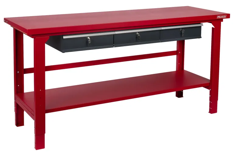 PELA 502976 on tukeva työpöytä, jossa on laatikkosarja ja laskutaso. Työpenkin mitat ovat 650 x 2000 mm, se on teräsrakenteinen ja siinä on metallipinnoitettu vanerilevy. Säädettävät jalat työskentelykorkeudella 900-1155 mm. Laatikkosarja Profi, 3 vahvaa laatikkoa työpöydälle 502978. Kaikki laatikot ovat kuulalaakeroituja ja niissä on lukot, syvyys 570 mm, leveys 370 mm ja korkeus 130 mm. Hyllytaso työpöydän jalkojen väliin asennettavaksi, täydellinen ylimääräinen laskutila.