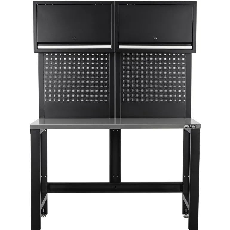 Pela 549439 on erittäin vakaa työpöytä yläkaapilla ja työkalutauluilla, joka mahdollistaa organisoidun ja tehokkaan työpisteen autotalliin, työpajaan tai teollisuustilaan.