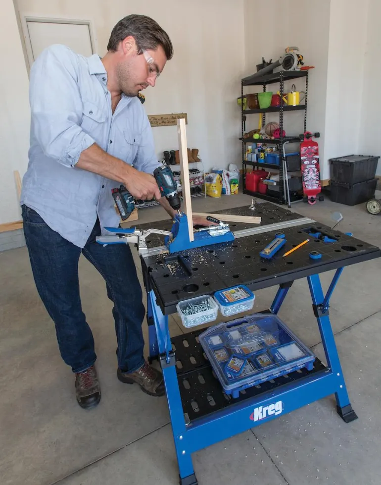 KREG Mobile Project Center on työpöytä, jonka monipuolinen työpinta sopii erityyppisiin työ-, korjaus- ja puuntyöstöprojekteihin. Työpöytä tarjoaa vankan alustan kaikentyyppisille projekteille ja se voidaan myös taittaa ja sijoittaa sivuun. Puristimen avulla pidät materiaalit paikallaan työskenneltäessä. Työpöytä kestää jopa 158 kg kuormituksen ja siinä on sisäänrakennettu säilytyshylly. Mobile Project Center on myös mukautettu käytettäväksi Kregin eri työkalujen kanssa.