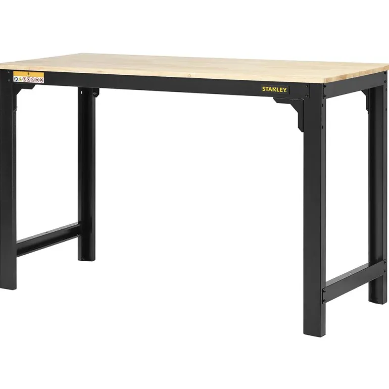 STANLEY®-työpöytä, jonka rungon leveys 60 cm. Päällä 25 mm:n paksuinen puinen pyötälevy, joka kestää 500 kg painoa ja on helposti koottava. Tukeva teräsrunko.