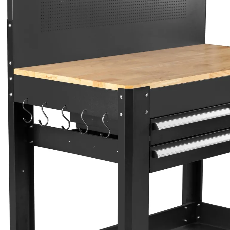 Työpöytä ulosvedettävillä laatikoilla, laskutasolla ja yläkaapeilla. Työtaso on valmistettu jauhemaalatusta teräslevystä (mattamusta), jonka päällä on puinen työtaso.
