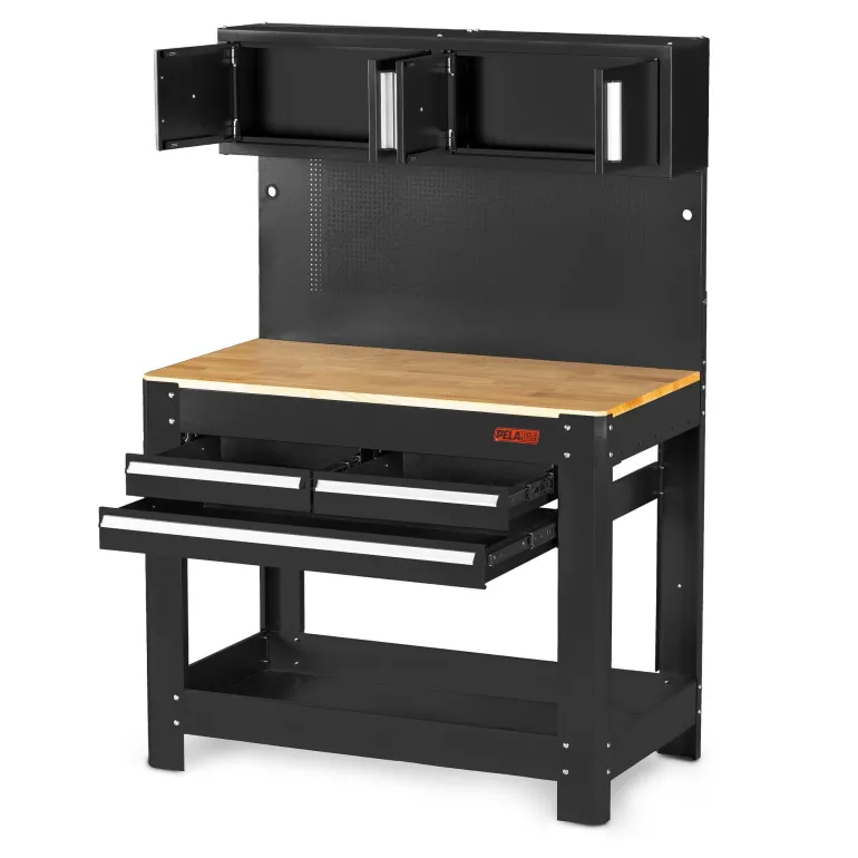 PELA 546275 on työpöytä ulosvedettävillä laatikoilla, laskutasolla ja yläkaapeilla. Työtaso on valmistettu jauhemaalatusta teräslevystä (mattamusta), jonka päällä on puinen työtaso. Työtason alla on 3 ulosvedettävää kuulalaakeroitua laatikkoa ja niiden alapuolella reilun kokoinen laskutaso esim. laatikoille ja muille osille. Kalusteen rungossa on lisäksi työkalutaulu pyöreillä rei`illä, jota voidaan täydentää PELAn työkalukoukuilla ja muilla pidikkeillä työkalujen ja tarvikkeiden ripustamista varten. Työkalutaulun yläpuolella on 2 yläkaappia ovilla, jotka sopivat täydellisesti esimerkiksi tölkkien ja pullojen säilyttämiseen. Pöydän yhdellä lyhyellä sivulla on myös koukut työkalujen ripustamiseen ja muuhun säilyttämiseen.