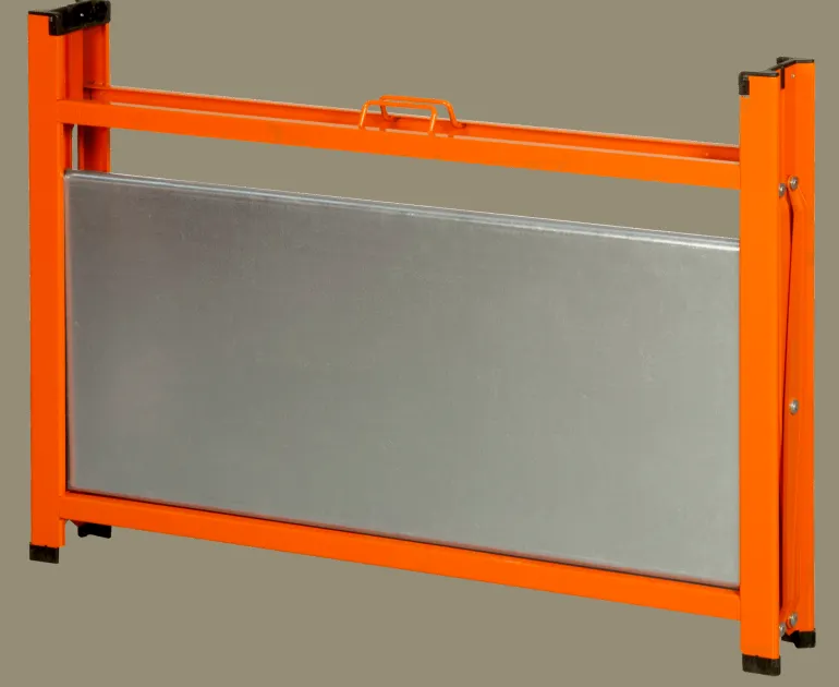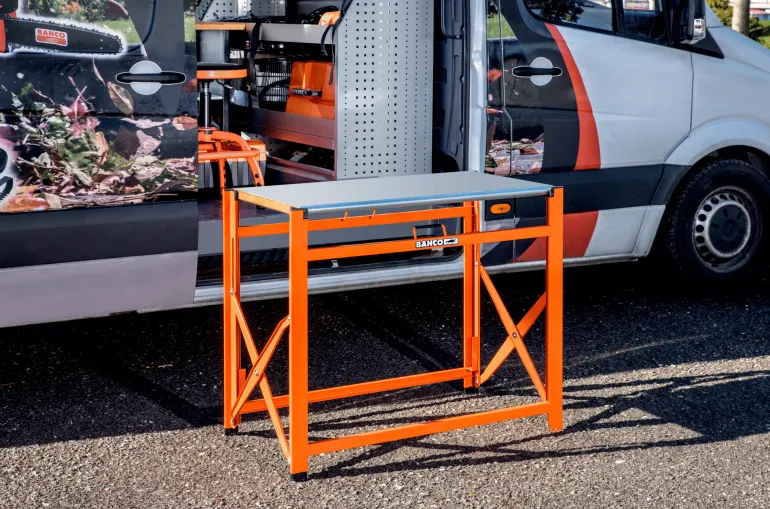 Kokoontaitettava työpöytä, jossa 30 mm työtaso MDF-levyä (toisella puolella kansilevyä sinkitty pelti). Kokoontaittuva mutta vankka saksirakenteinen työpenkki. Kompakti ja helppo säilyttää kokoontaitettuna.