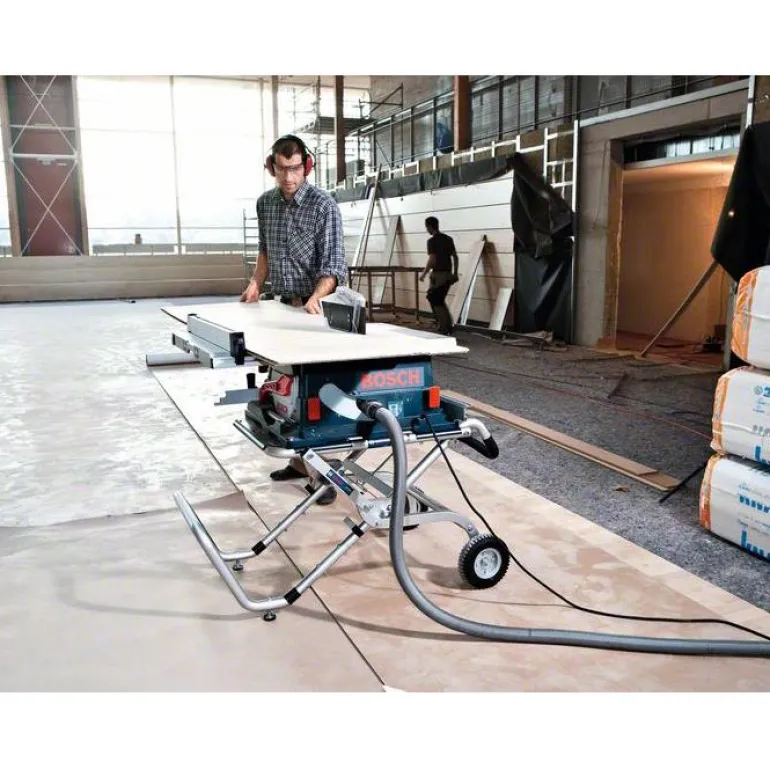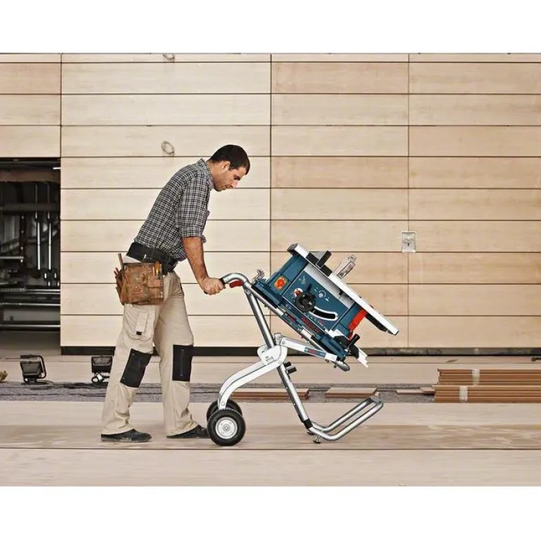 Bosch GTA 60 W Professional on kätevä työstöpöytä/kärry katkaisu- ja jiirisahoille sekä yhdistelmäsahoille. Työpöydän suurien kumipyörien avulla sahaa on helppo kuljettaa myös epätasaisella rakennustyömaalla. Lisäksi kärryn jalkoja voi säätää niin, että sen asento on aina vakaa kaikilla alustoilla.
