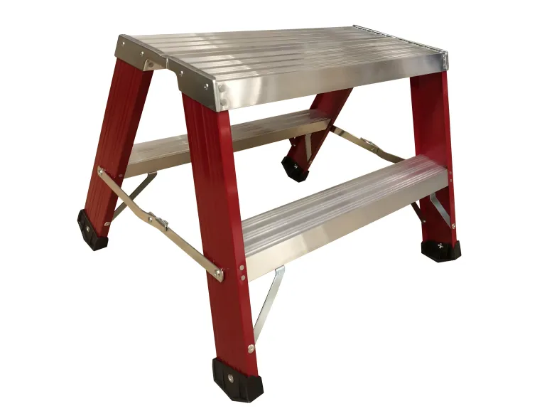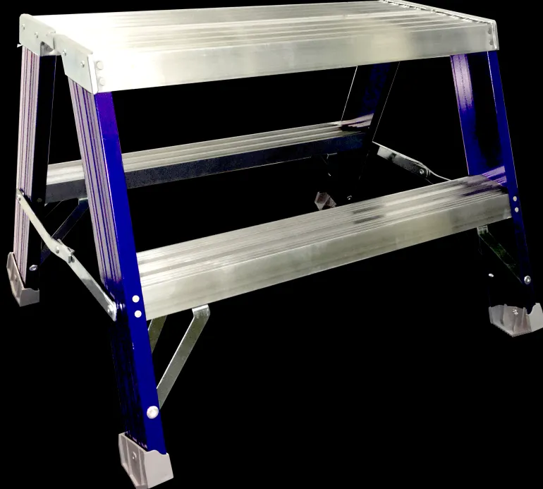 Vakaa ja tukeva työpukki. Alustan mitat 605 x 205 mm, askelmasyvyys 81 mm. Vahvoilla lattiasuojilla tikkaat seisovat tukevasti alustaa (maata) vasten. Lakatut yksityiskohdat estävät käsien ja vaatteiden mustumisen.