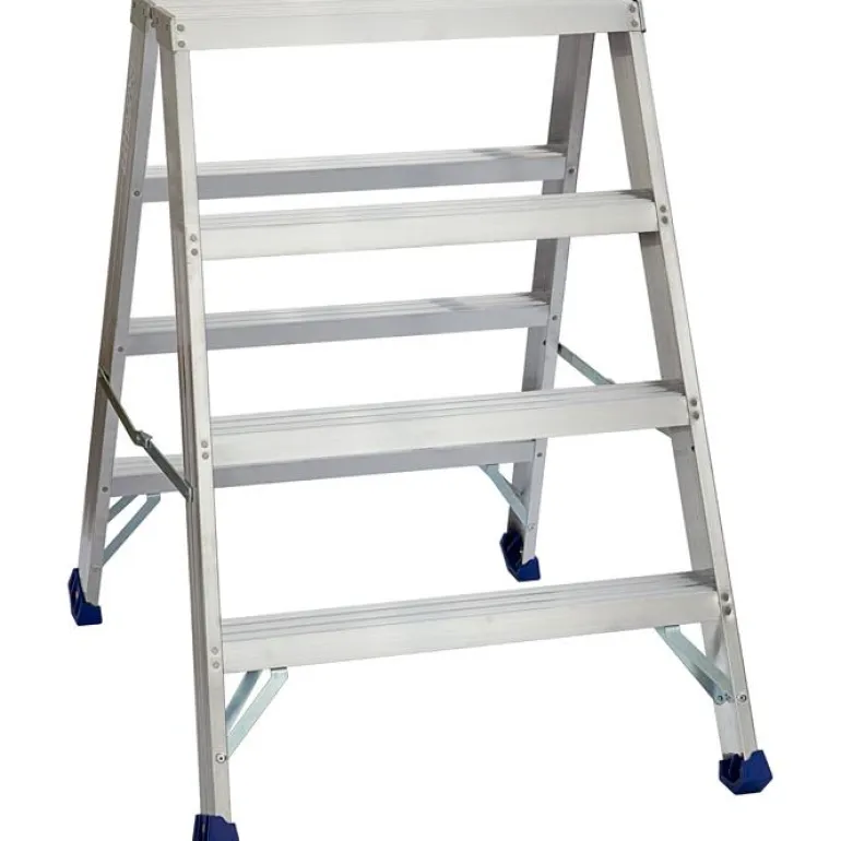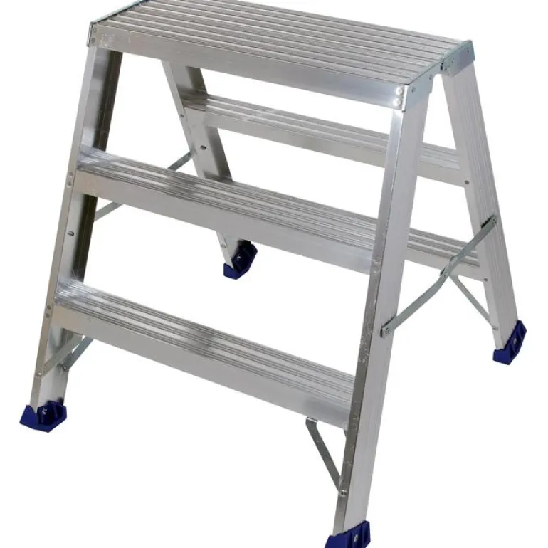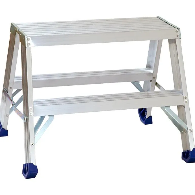 Alumiininen työpukki. Hydrauliniittauksen ansiosta saadaan paras vakaus ja pitkä käyttöikä. Portaiden pinnat ovat vahvasti kuvioidut turvallisen pidon vuoksi. Työskentelytaso 605×250 mm ja askelman syvyys 8 cm.