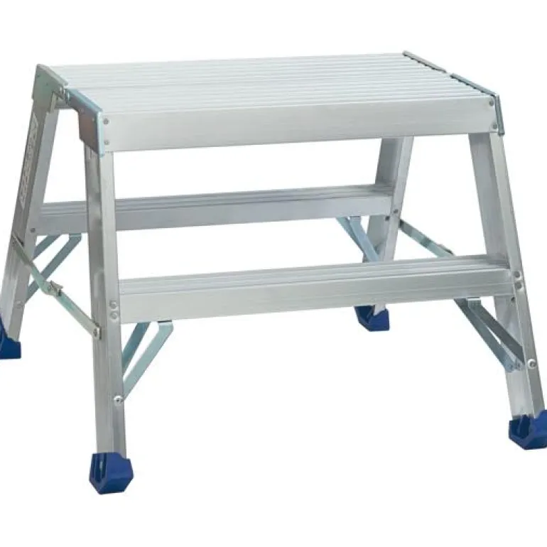 Alumiininen 2-portainen työpukki. Syvä taso 60 x 35 cm ja vahvikkeet kaikissa jaloissa. Työpukin tason korkeus on 50 cm ja alaosan leveys 67 cm.