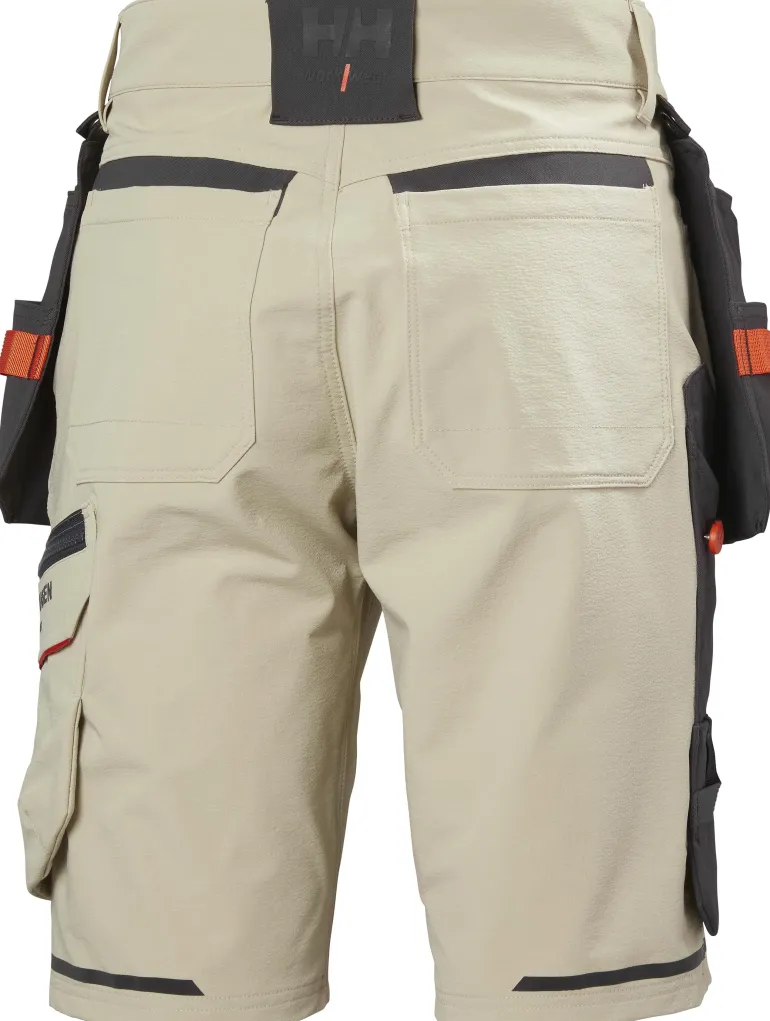 Kensington-rakennustyöshortsit kevyttä ja kestävää neljään suuntaan joustavaa kangasta. Vetoketjulliset, irrotettavat Cordura®-riipputaskut, joissa kaksinkertainen pohja ja kestävät nailontyökalulenkit. Heijastavat yksityiskohdat.