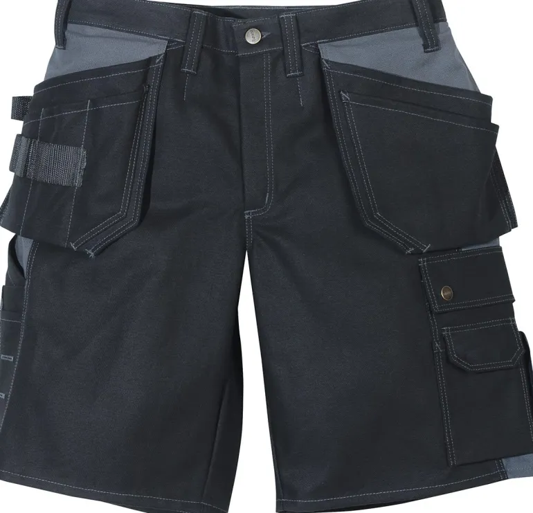 Työshortsit FAS-puuvillasta kahdella CORDURA-vahvistetulla sisääntaitettavalla riipputaskulla nauloja varten – toinen varustettu yhdellä lisätaskulla ja toinen kolmella pienemmällä sekä työkalulenkeillä. Shortsit ovat ÖKO-TEX-sertifioidut.