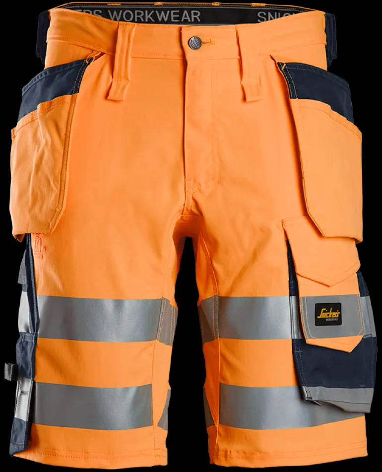Kaksisuuntaisesta joustokankaasta valmistetut huomioshortsit lisäävät joustavuutta, käyttömukavuutta ja näkyvyyttä hämärissä ja riskialttiissa työympäristöissä. Riipputaskulliset luokan 1 huomioshortsit, jotka soveltuvat rakennustöihin, tietyöhön ja kuljetusalalle. Shortseissa on liikkuvuutta parantava haaralevike, riipputaskut ja runsaasti käteviä taskuja lisäsäilytystä varten.