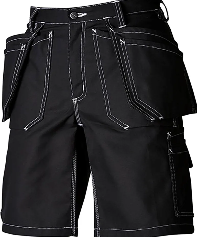 Työshortsit, joissa riipputaskut Cordura®-vahvikkeilla. Vasemmassa riipputaskussa lisätasku ja oikeassa riipputaskussa on kolme pientä lisätaskua, työkalulenkit ja piilotettu, ulos vedettävä henkilökortin pidike. Kaksi palkeellista etutaskua ja takataskua. Säädettävä vasaralenkki. Edessä mittatasku, joka on sijoitettu alas mukavuuden parantamiseksi. Mittataskussa on kaksi puukonpidikettä, puukkolenkki ja kynätasku. Iso reisitasku, jossa on puhelintasku, puukkopidike ja lisätyökalutasku. D-rengas. Materiaali: 100 % puuvilla, 380g/m². Pesuohjeet: Konepesu 85 °C.