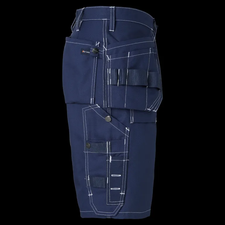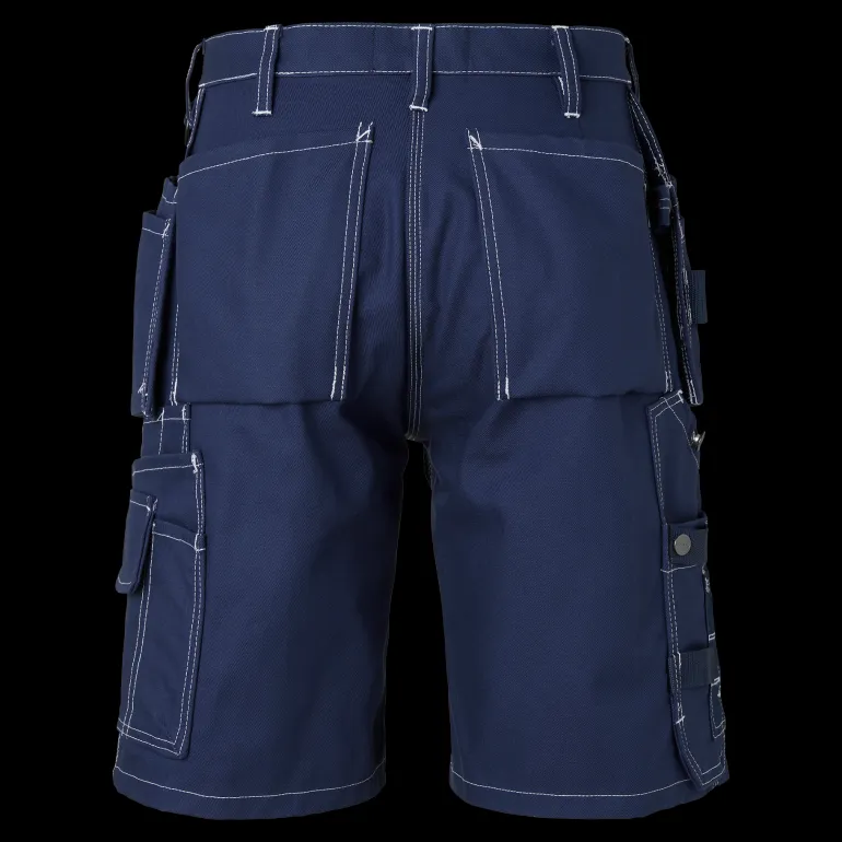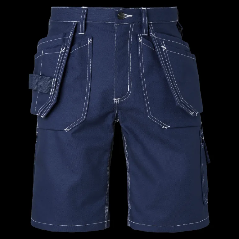 Työshortsit, joissa riipputaskut Cordura®-vahvikkeilla. Vasemmassa riipputaskussa lisätasku ja oikeassa riipputaskussa on kolme pientä lisätaskua, työkalulenkit ja piilotettu, ulos vedettävä henkilökortin pidike. Kaksi palkeellista etutaskua ja takataskua.