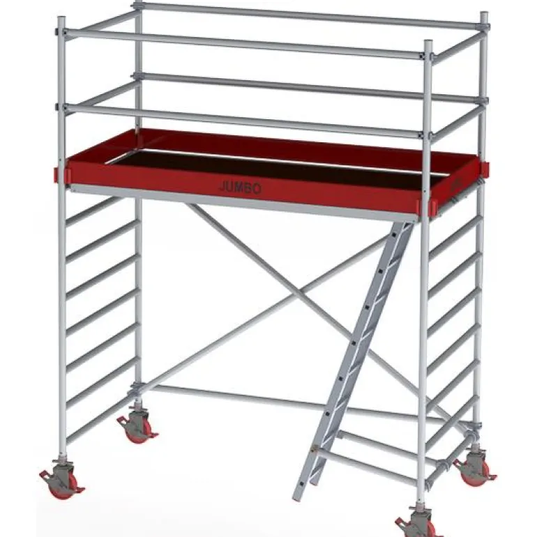 Laggo Jumbo Pro on leveä työteline, jossa on täyshitsatut päätykehykset. Lukituskynnet alumiinivalua. Tukeva ja kestävä rakenne. Telineen pyörien halkaisija on 20 cm ja työtason mitat 2,5 x 1,2 m. Putken koko on 50 x 2 mm. Työtasot kahden metrin välein, kaksoissuojakisko kaikilla tasoilla. Sisältää koukulliset tikkaat. Täyttää standardin AFS 2013:4 vaatimukset. Kokonaiskorkeus 720 cm.