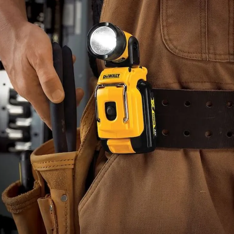 Työvalaisin, jonka voi kääntää eri asentoihin, vyökoukku ja magneettikiinnitys. Toimii DEWALTin Li-ion 10,8/12V:n akuilla.