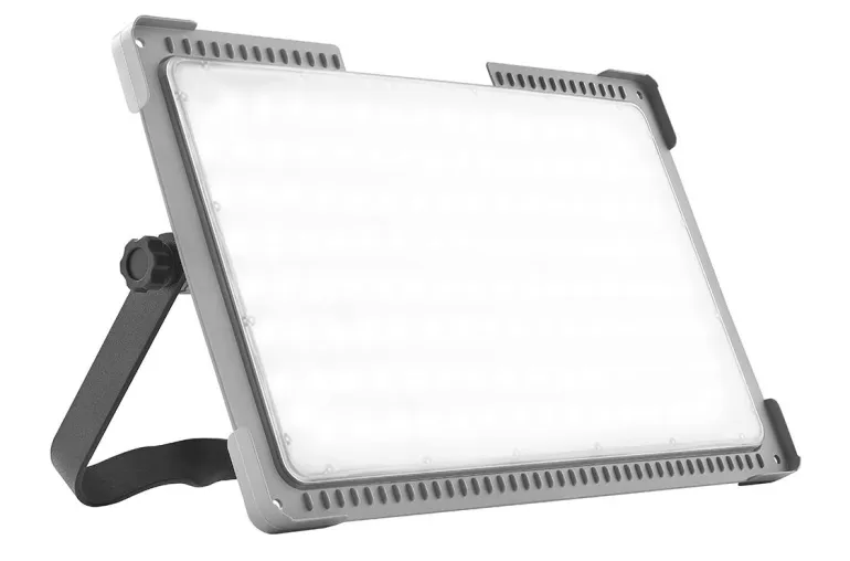 Kätevä 78 W:n työvalaistus, jossa 9500 lm, IP54 ja 5 metrin kaapeli. Kaksi ulostuloa takana. Jalustan kiinnike, säädettävä varsi ja kaapelikela takana.