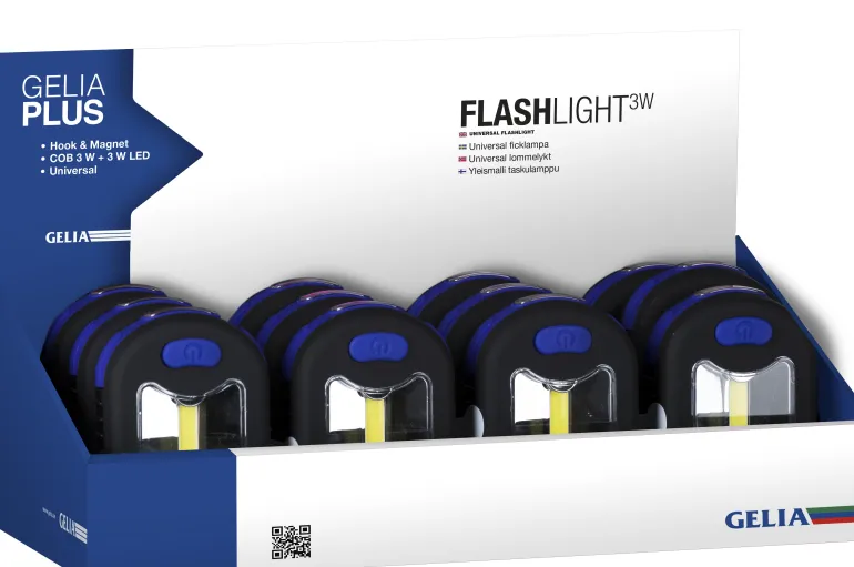 Gelia Cob on iskunkestävä työvalo 3 W, joka voidaan ripustaa tai kiinnittää käyttäen lampun takaosassa olevaa magneettia. Kaksi valotehoa (100 % ja 50 %) ja valovirta 180 luumenia.
