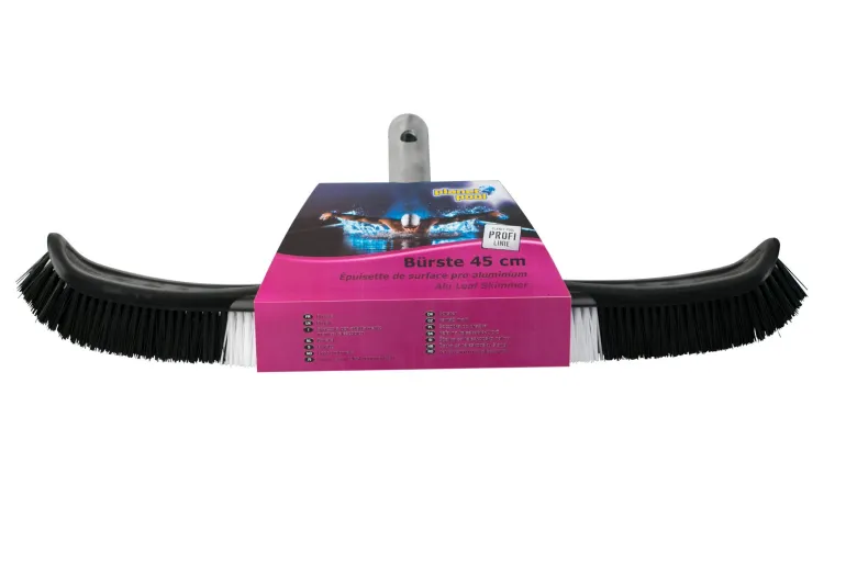 Alumiininen uima-allasharja, jonka leveys on 45 cm ja joka sopii teleskooppivarteen. Harja on käytännöllinen, tyylikäs ja kestävää ammattilaislaatua.