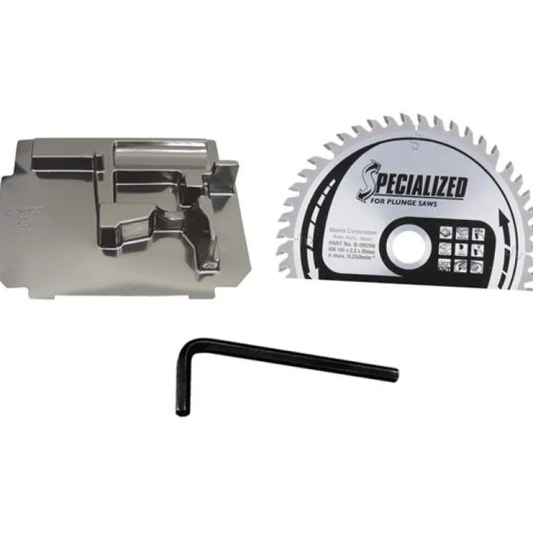 Paketti, jossa Makita SP6000 -upotussaha ja 1,4 metrin ohjauskisko tarkkaan sahaukseen. Sahalla työskentely sisätiloissa on miellyttävää tehokkaan pölynpoiston ansiosta.