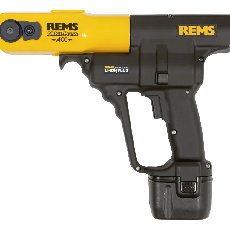 REMS Akku-Press on 14,4 V:n väännin, yhdellä kädellä käytettävä, automaattinen palautus ja kapasiteetti Ø 10-54 mm. Kompakti, kätevä ja kevyt kone, joka yhdessä akun kanssa painaa vain 4,3 kg ja jonka paino jakautuu optimaalisesti. Voidaan siten käyttää missä tahansa, käsin, pään korkeuden yläpuolella, myös ahtaissa tiloissa. Ergonomisesti muotoiltu kotelo, jossa on upotettu kahva.