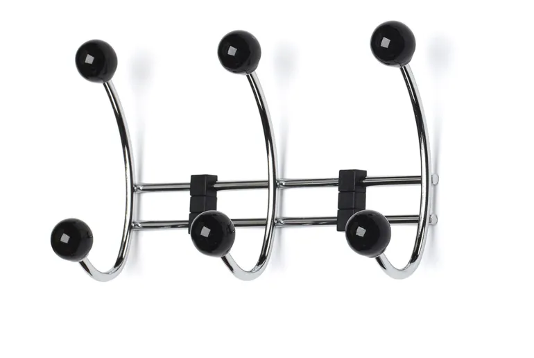 Ovinaulakko kromattua terästä, jossa mustat posliininupit. Sopii yhtä hyvin lastenhuoneeseen kuin eteiseenkin. Naulakko, jossa reilusti tilaa vaatteille, käsineille, pusseille jne.
