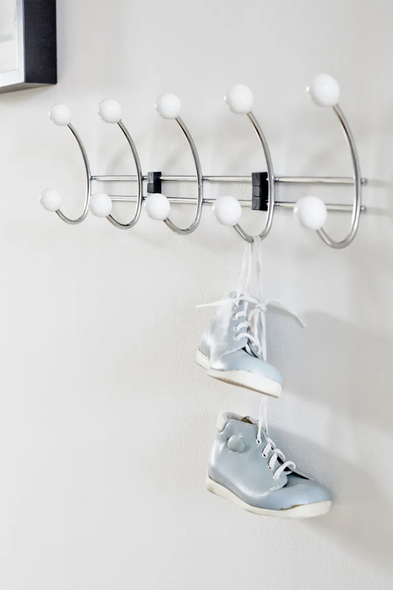 Naulakko kromattua terästä, jossa mustat posliininupit. Sopii yhtä hyvin makuuhuoneeseen kuin eteiseenkin. Naulakko, jossa reilusti tilaa vaatteille, käsineille, pusseille jne.