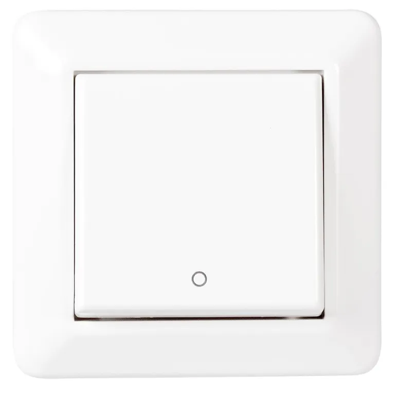 Puhtaanvalkoinen painevaihtokytkin, jossa kanta, keinukytkin ja runko on valmistettu halogeenivapaasta termoplastista. Painettava kansirunko ja keinuvipu ovat vakiovarusteita.