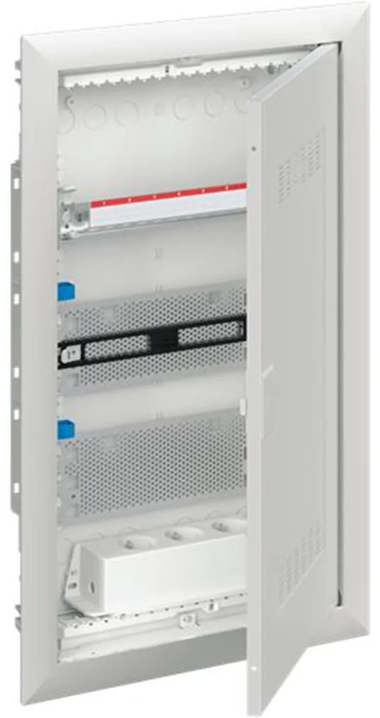 Vakiokeskuskotelo uppoasennukseen, sarjaan ABB UK600, ovikehyksellä ja ovella, kotelointiluokka II (kaksoiseristetty) ja IP30, sovellettavat standardit: EN 60670-24, IK-koodi 07, Nimelliskäyttöjännite 400V AC 50/60 Hz, nimellisvirta 63 A, hehkulangan resistanssi 850°C, jauhemaalattu, RAL 9016, kestomuovinen kotelo, jossa kehys ja ilmastoitu ovi, teräslevyovi, TIP-suljin, oven avauskulma 120 astetta, oven sarana oikealla tai vasemmalla, N/PE ja integroitu kaapelikiinnike.