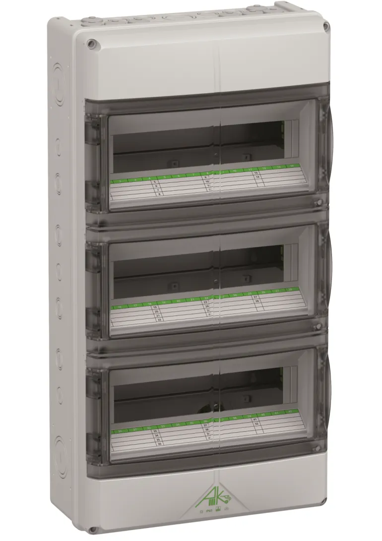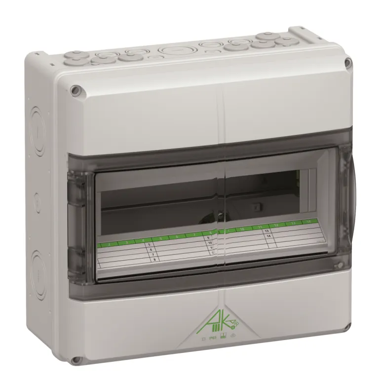 Ilmalla tuuletettava pinta-asennettava vakiokotelo, 150 mm kiskojen väli, integroitu ilmanvaihtoelementti kondension vähentämiseksi, joustavat insertit ylhäällä, suoja- ja tekstitarrat, ylimääräisellä kaksoistiivistyskalvolla ja lisätarvikkeilla, suojausluokka IP65, suojausluokka II, halogeeniton, VDE-hyväksytty, iskunkestävyys IK08, ruuviton PE/N-puristuskisko, ammoniakinkestävä.