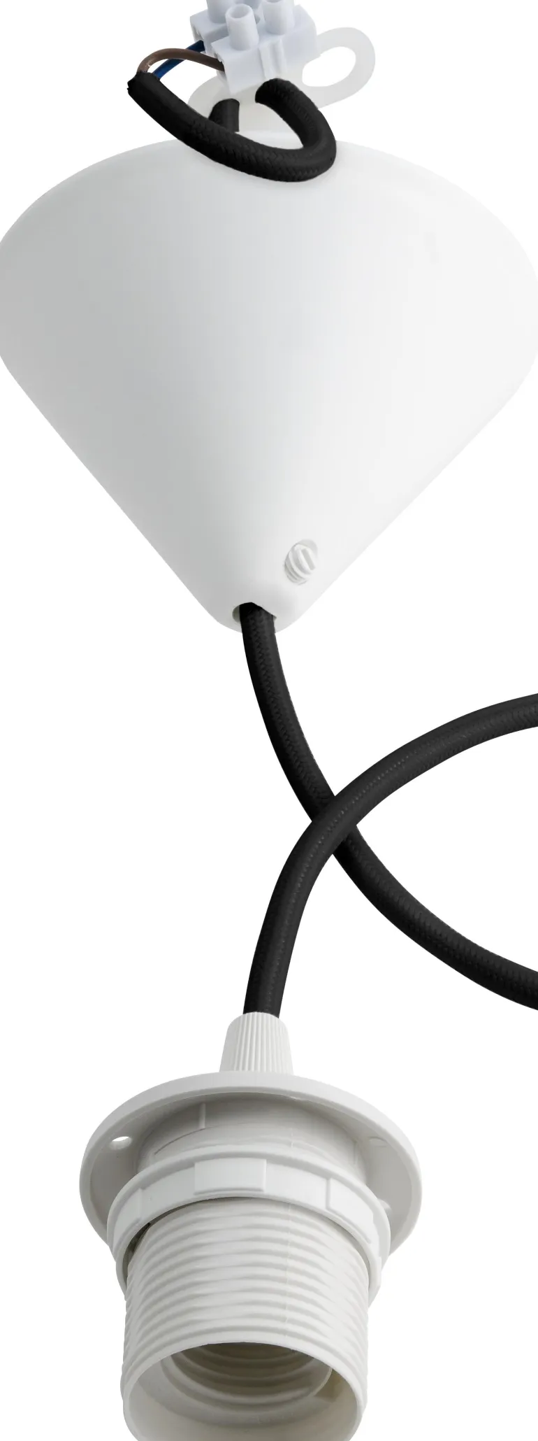 Valaisimen ripustusjohto tekstiilikaapelilla. Ripustusjohdossa on lampunpidike E27, johdon lyhentäjä, sokeripala ja valkoinen kattokupu sivuruuvilla.