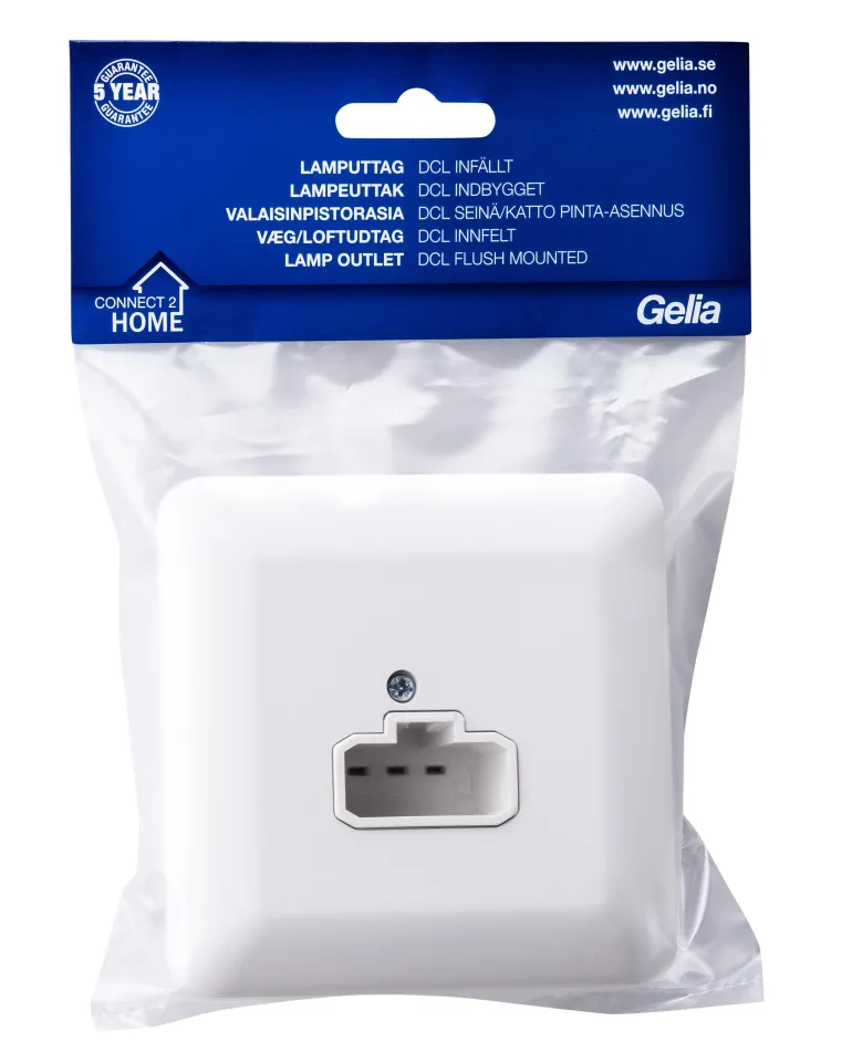 Valaisinpistorasia, DCL, asennus seinään laiterasiassa c/c 60 mm tai liitäntärasiassa c/c 67 mm. Kattoasennusta varten valaisinpistorasia asennetaan kattorasiaan c/c 70 mm. DCL-laitteita tulee käyttää vain maadoitettujen järjestelmien kanssa.