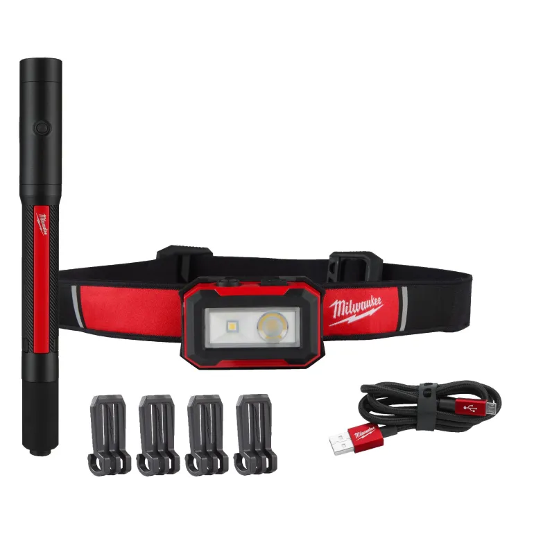 Milwaukee 4933492104 TRUEVIEW™-valaisinsarja, joka sisältää USB-ladattavan IR HL450-otsalampun ja USB-ladattavan IR PL250-kynävalon. Mukana 4 x kypäräkiinnikkeitä ja USB-kaapeli.