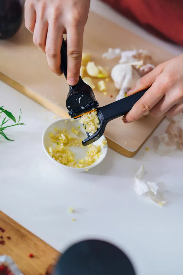 Helppokäyttöinen valkosipulipuristin. Kaksiosainen rakenne, helppo purkaa ja puhdistaa.