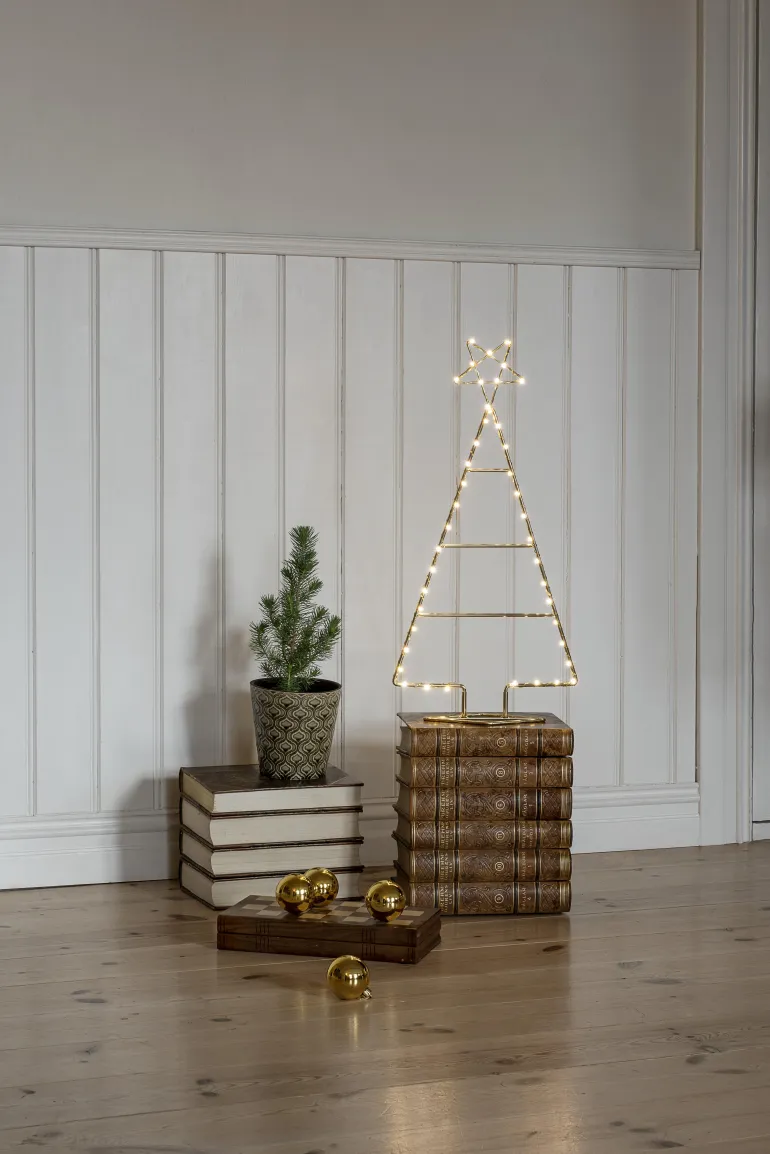 Konstsmide 1790-880 on metallinen valokoriste (kuusen muoto/väri messinki), jossa 45 amber-väristä mikro-LEDiä. 3V / IP20.