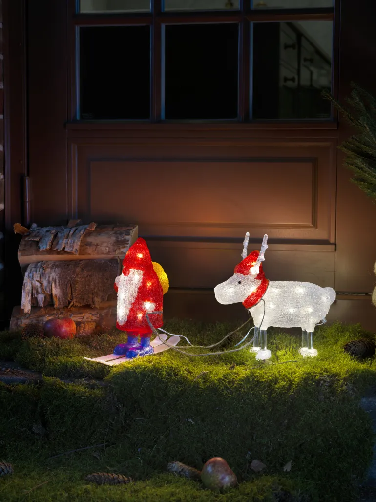 Konstsmide 6239-103 on valokoriste akryylia (tonttu ja poro), jossa on 40 lämpimän valkoista LEDiä. 24 V/IP44.