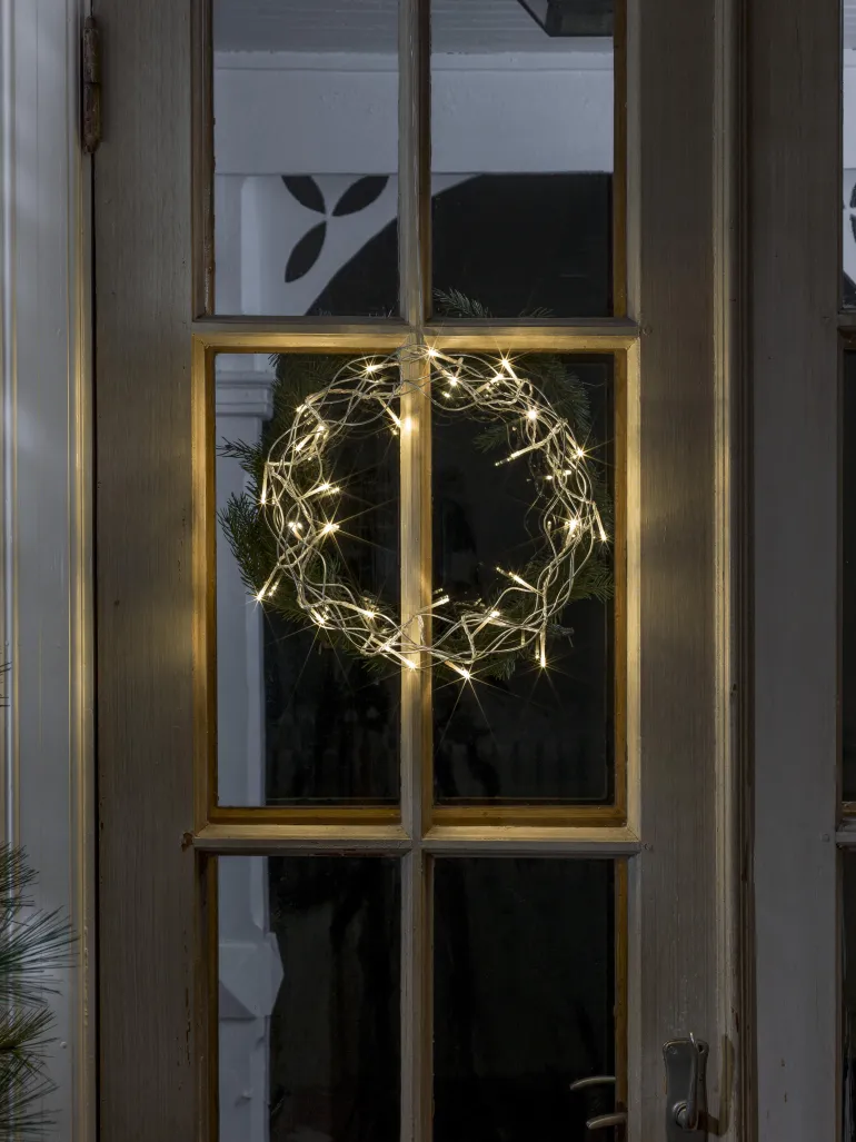 Konstsmide 2890-303 on valokranssi, jossa on 32 lämpimän valkoista LEDiä. 30 cm metallia, väri hopea, 24 V/IP20.